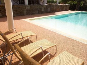 Composée de granulats naturels et d’une résine hautement résistante, la moquette de pierre pour plage de piscine forme un revêtement continu, sans raccord ni joint visible.