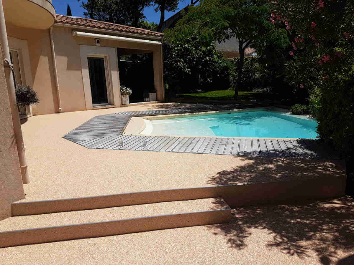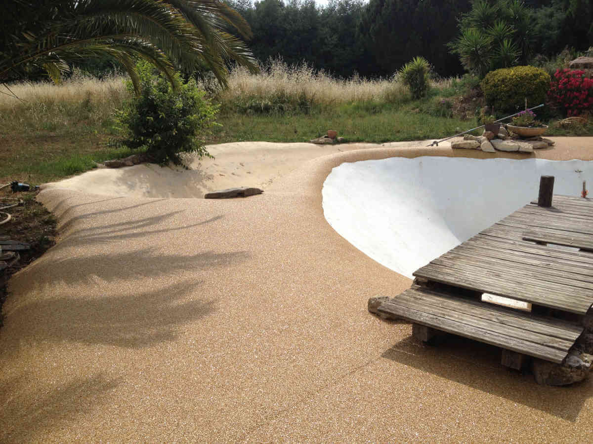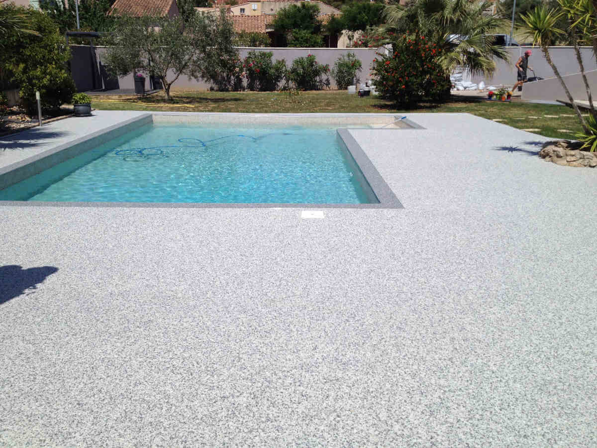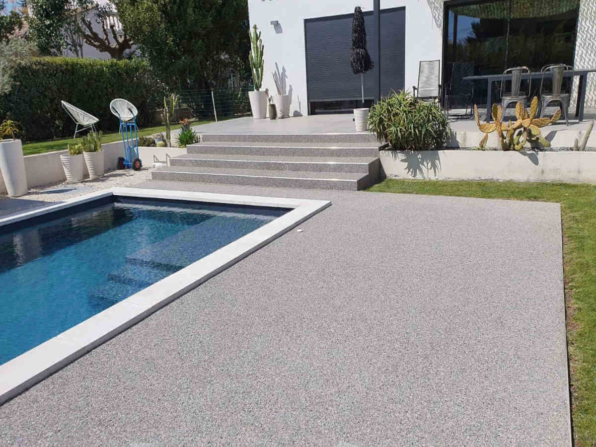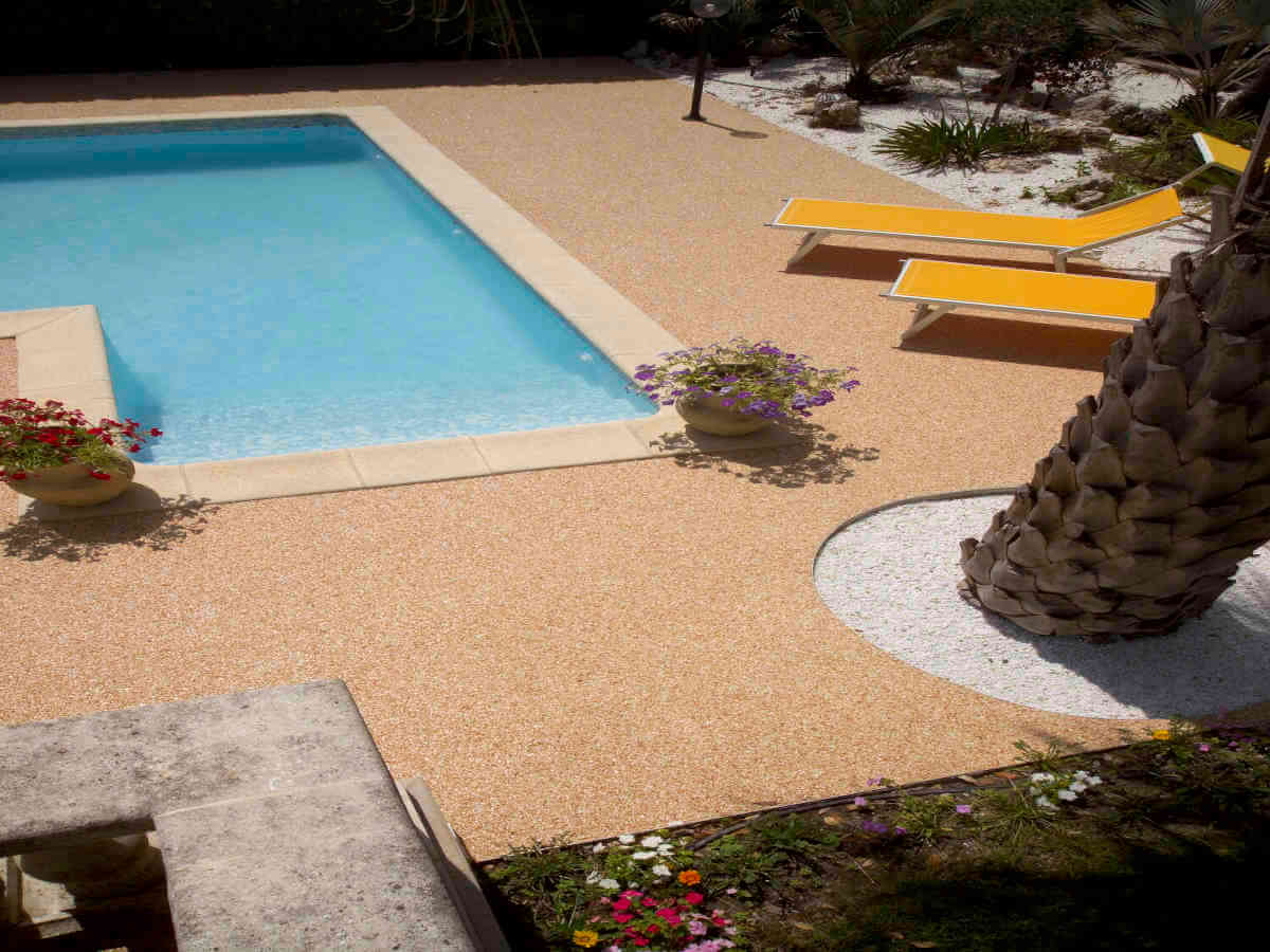 Revêtements résine, moquette de pierre pour plages de piscine