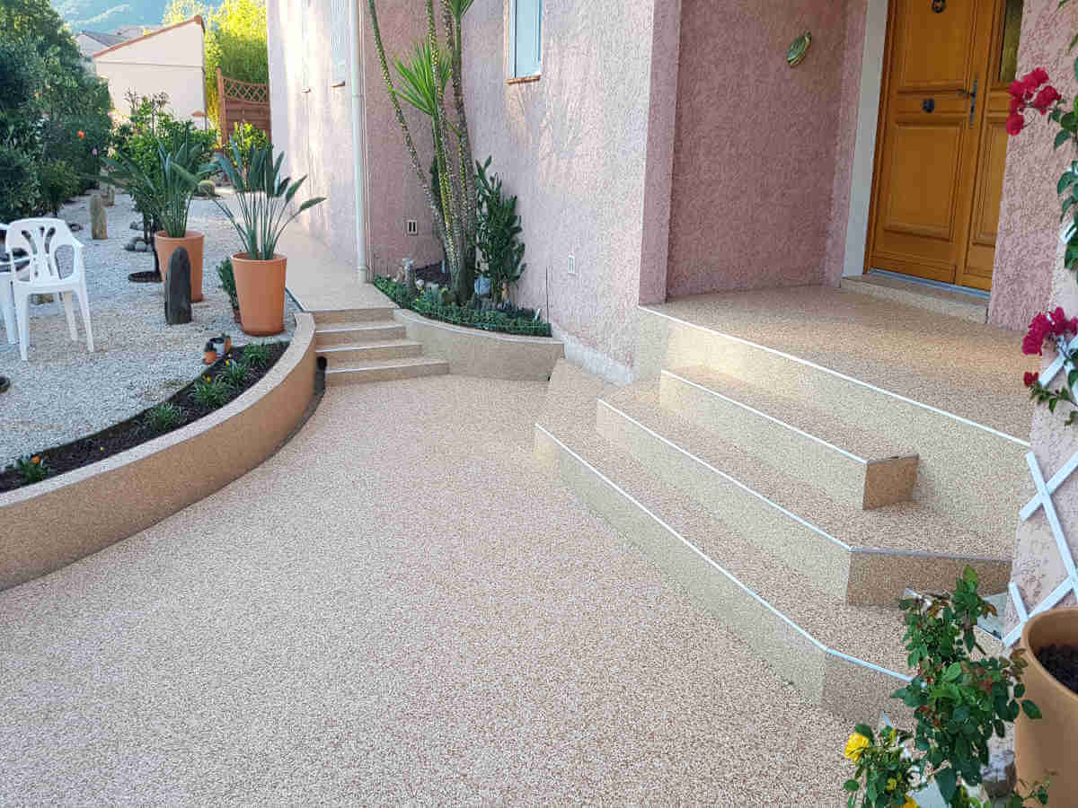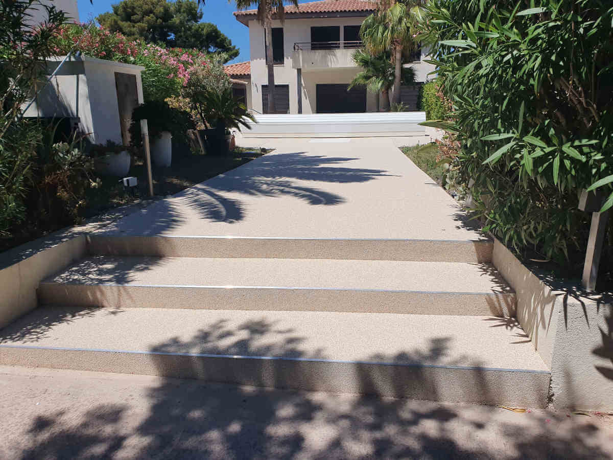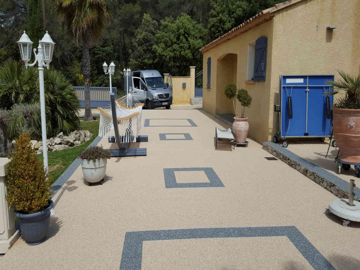 Allée d’entrée et garage en moquette de pierre résine à FrejusAllée d’entrée et garage en moquette de pierre résine à Frejus