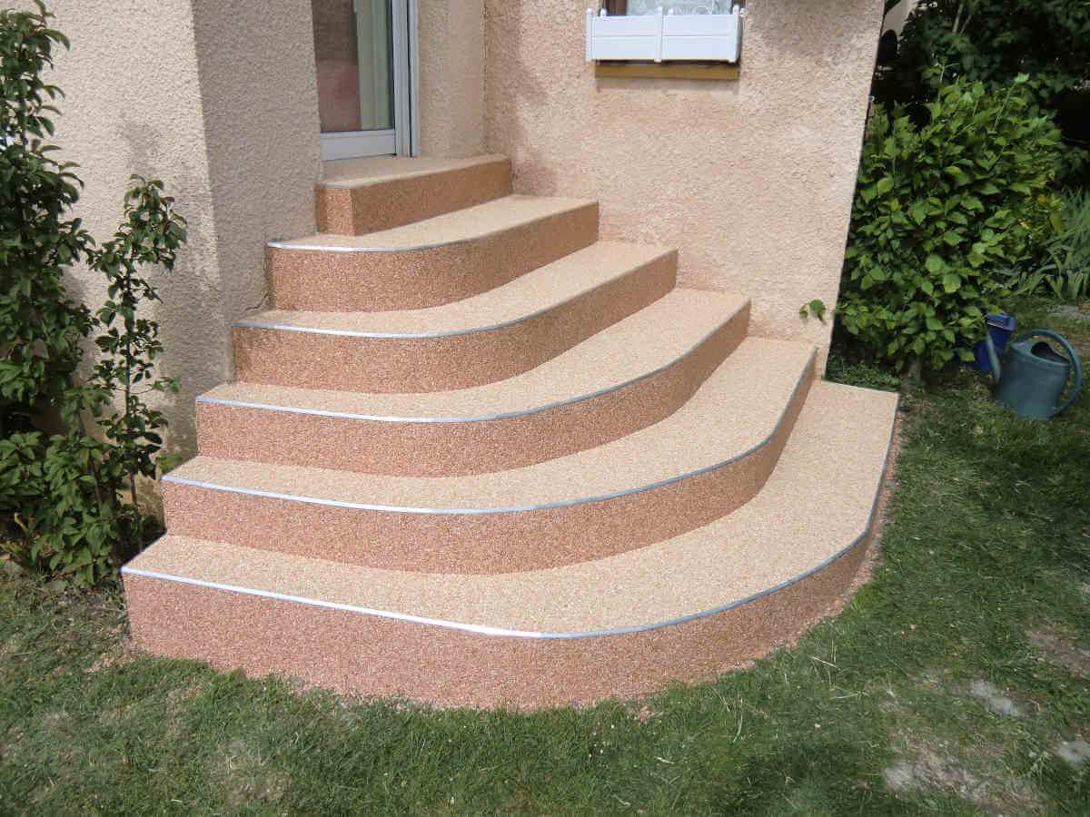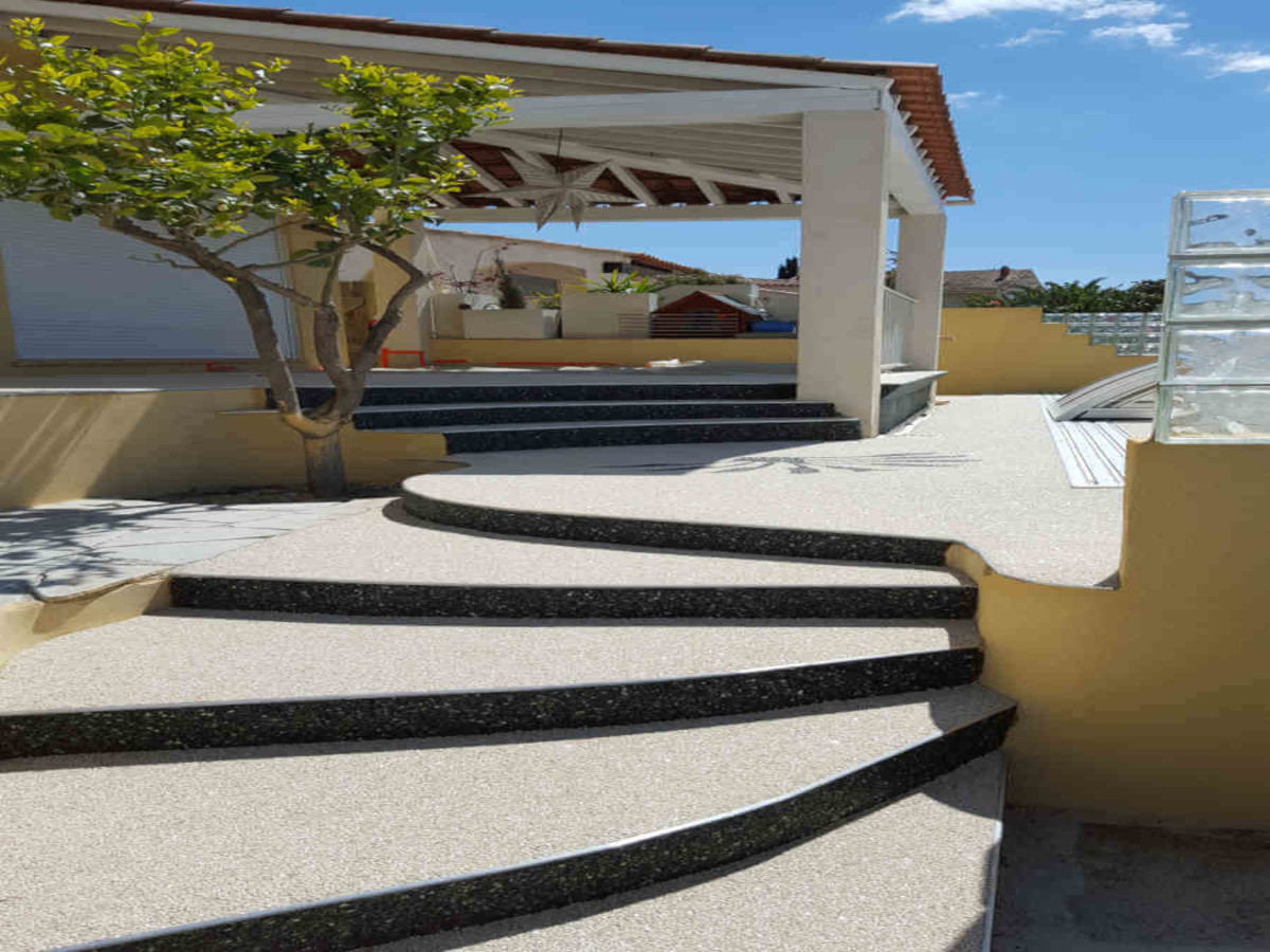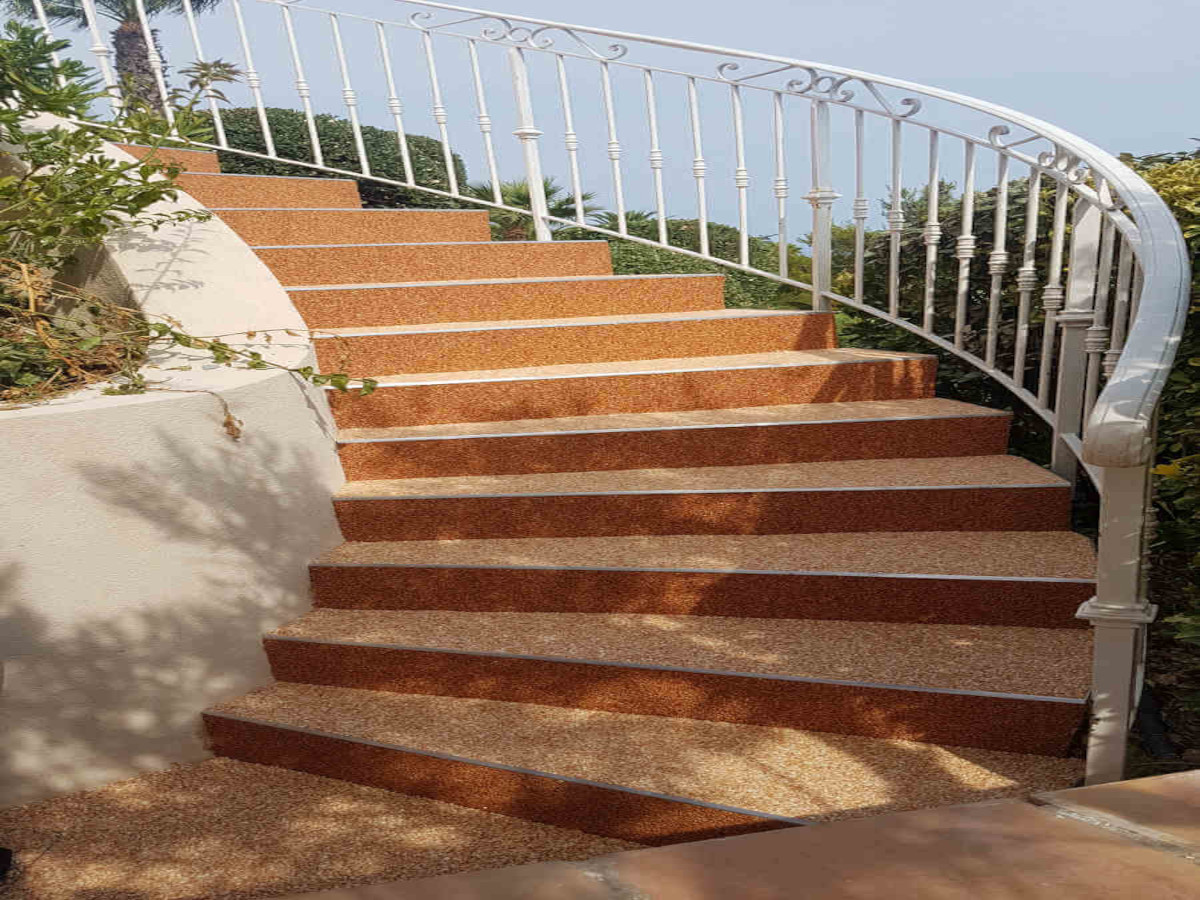Le revêtement en résine, moquette de pierre pour escaliers permet de concilier sécurité, durabilité et esthétique. Antidérapant, même mouillé, et agréable sous le pied, il sécurise vos montées et descentes avec efficacité. Il apporte une finition soignée à vos extérieurs, quelle que soit la configuration. Ce revêtement s’adapte à toutes les formes d’escaliers : droits, tournants, ou irréguliers. La pose est uniforme, continue et sans joints visibles, pour un rendu propre et stable. Les réalisations de Solutions Polymers montrent des escaliers transformés en éléments à la fois pratiques et élégants de votre aménagement.